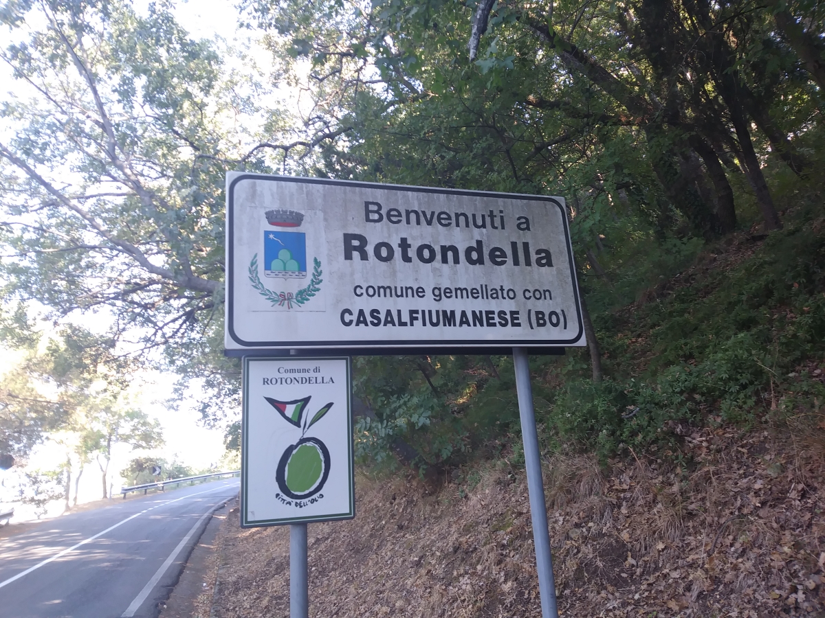 Ad un certo punto mi pervade quasi l'idea di sostare sotto Rotondella, cercando qualche sistemazione addocchiata il giorno prima. Ma no. È lì e costerà uno sforzo non indifferente. Ma ho idea che perseverando e insistendo magari la vita mi ripagherà. Inizio questa serie di curve che sono davvero tante. O forse molto distanti una dall'altra, perché ho come l'impressione di girare sempre intorno al paese, arroccato sulla cima di questa montagna. Almeno sono al coperto, protetto da grossi arbusti che mi permettono di camminare al fresco. Continuo nella salita e l'ultima parte mi impegna non poco dal punto di vista fisico. Qualche piccola sosta per rifiatare ogni tanto. Ma inizio a vedere da lontano le prime abitazioni. È la volta del cartello e ora è ufficiale. Dopo tanti sforzi sono arrivato a Rotondella!
